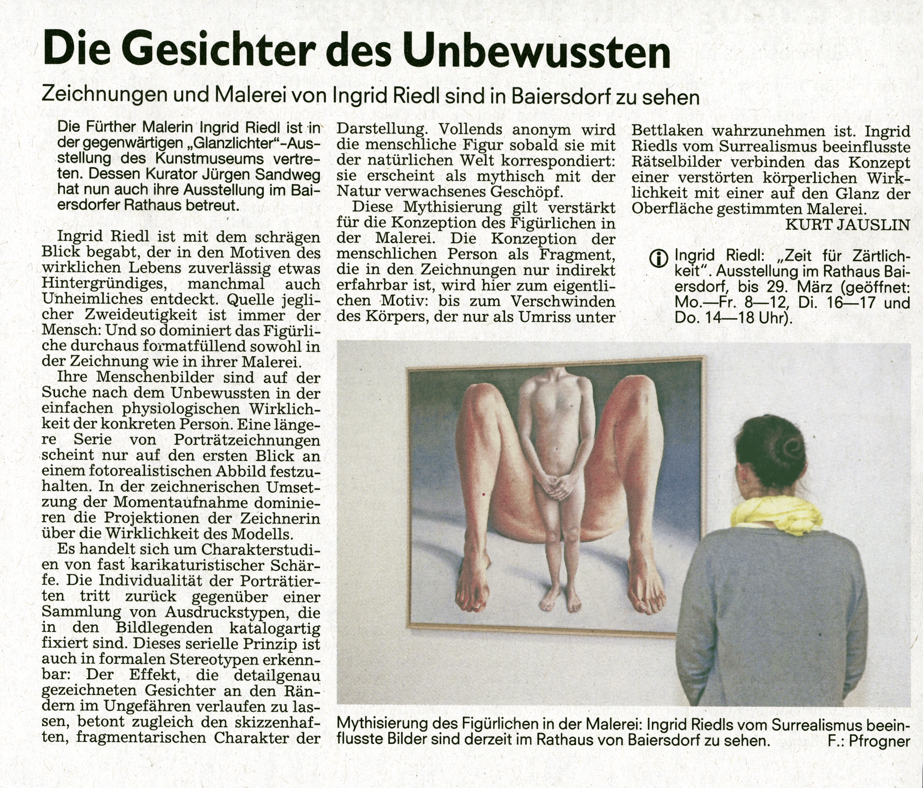 „Mit einer faszinierenden Akribie und zeichnerischen Sorgfalt fixiert Ingrid Riedl in Graphit auf Papier ihre Hautlandschaften. Die Assoziationen, die sich beim Blick auf diese in hundertfachen Schwarz-Weiß-Grau-Nuancen changierenden Ausschnitten der Epidermis dem Betrachter aufdrängen, sind vielgestaltig: Erkennen wir hier frappierende Ähnlichkeiten mit einer von Dünen durchzogenen Wüste, sind es dort an Baumborken und schrundige Rinden erinnernde Strukturen. Einmal gleichen die Hautfalten Pfaden in dunkle Höhlen, ein andermal liegen sie wie Pflanzenfasern eng verwachsen aneinander. Schließlich kommen einem auch Oberflächen wie die von Nüssen in den Sinn, oder eine Hautpartie lässt sogar an dicht geschichtete Wolkenbänder denken.“